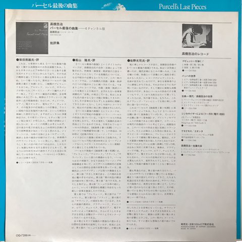 イギリスのバロック時代の作曲家、ヘンリー・パーセルの作品を時にはそのまま引用したり時には一部分をミニマルに繰り返したりと様々な鍵盤楽器を使い豊富な音色でコラージュして別の作品に作り替えた高橋悠治の75年作。ミニマル×ドローン×ミュージック・コンクレートなA面後半が圧巻。