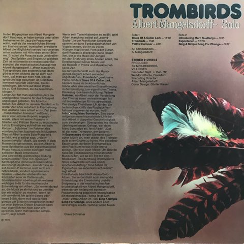 Jaco Pastorius、Peter BrotzmannやHan Benninkらとも共演しフリー・ジャズ・アンサンブルGlobe Unity Orchestraにも参加していたドイツ人奇才トロンボーン奏者Albert Mangelsdorffが73年にリリ−スしたトロンボーン・ソロ・アルバム。フリー・ジャズといってもこの人のトロンボーンはフリーキーさは全くなく、むしろ笑ってしまうくらいの音色も出てくるユーモアあふれる特殊な奏法で、どこに行くか先が読めない独創的でユニークなインプロを聴かせてくれます。その中でも重音奏法を駆使した、まるで一人エリントン・アンサンブルのような不思議な響きの「Sing a Simple Song for Change」は圧巻。