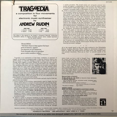 ミュージック・コンクレートの創始者ピエール・シェフェールや電子音楽巨匠シュトックハウゼンに影響を受けたアメリカの作曲家アンドリュー・ルーディンが、US名門レーベルNonesuchから電子音楽制作の委託を受け当時最新だったモーグ・シンセサイザーを用いて作られた68年作。モーグが宇宙空間を縦横無尽に動き回るぶっ飛び電子音楽傑作。アンドリュー・ルーディンはイタリアの映画監督フェデリコ・フェリーニの69年作「サテリコン」のサントラ(妄想民族音楽名作!)にも参加しています。