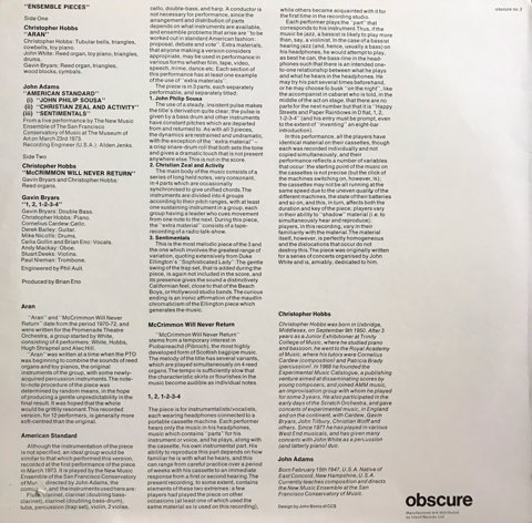 Brian Enoによるアンビエント/ミニマル/エクスペリメンタル・レーベルObscure Recordsの75年第2作目のアルバム。Christopher Hobbsのミニマルな「Aran」「McCrimmon Will Never Return」、米ミニマリストJhon Adamsによる物憂げな管弦楽にラジオを通したような音響処理が施されたスポークン・ワードが退廃的に美しい「American Standard」、そしてCornelius Cardew、Derek Baileyが参加したGavin Bryarsの代表作のひとつ「1, 2, 1-2-3-4」は、ヘッドフォンでカセット・テープ・プレイヤーの音楽を聴きながらお互いの演奏は聞かずに合奏したという、スカスカで絶妙にバラバラのアンサンブルが素晴らしい傑作。