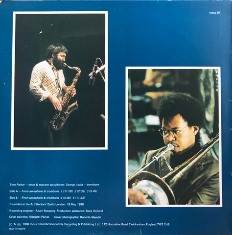 フリー・ミュージック名門レーベルIncusから80年にリリースされた、ソプラノ&テナーサックス奏者Evan Parkerとトロンボーン奏者George Lewisのデュオによるフリー・インプロヴィゼーション。サックスとトロンボーンとは思えない、奇っ怪でユニークで今まで聴いたことのないような音がポンポン出てくる至福の40分間。Ocoraなんかの民族音楽好きにもドンピシャな未知の音を探している人にオススメの特殊音楽傑作。