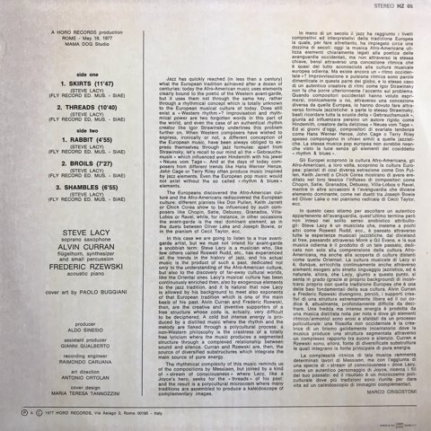 ポスト・フリーを追求する孤高のソプラノ・サックス奏者Steve Lacyがローマ滞在時にイタリアの名門レーベルHoroからリリースした77年作。A面はSteve Lacyのソロ・インプロヴィゼーション、B面にイタリアの伝説的実験音楽家集団MEV(Musica Elettronica Viva)のメンバーであるAlvin Curran、Frederic Rzewskiとのトリオによる演奏を収録。Lacyの創造力溢れるソプラノ、不協和なFrederic Rzewskiのピアノ、Alvin Curranのうにょうにょするシンセサイザーがインプロヴィゼーションしていく「Broils」が白眉。