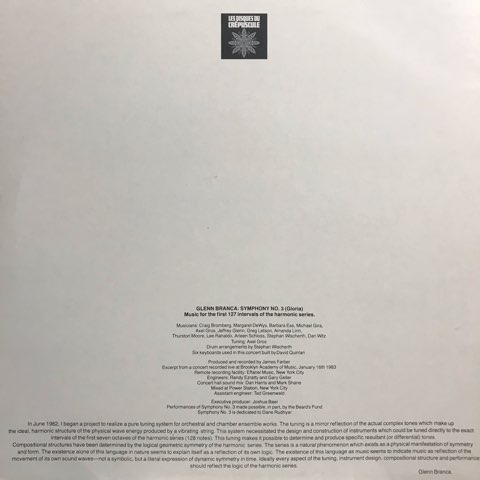 ノー・ウェイヴとミニマル・ミュージックをリンクさせたNYの前衛ギタリスト/作曲家Glenn Brancaが生涯をかけて作り続けたSymphonyシリーズのVol.3。Sonic YouthのThurston MooreやLee Ranaldo、SwansのMichael Giraも参加した変則チューニングによる13本のギターとドラムが織りなす倍音シンフォニー。水面に輝く光のようにキラキラとしたアンビエントなギター・アンサンブルから、音のレイヤーが重ねられ色彩豊かなドローンを経て、ドラムが煽る高揚感と共に分厚い音の塊になっていくA面の中盤〜後半が圧巻。是非爆音で!