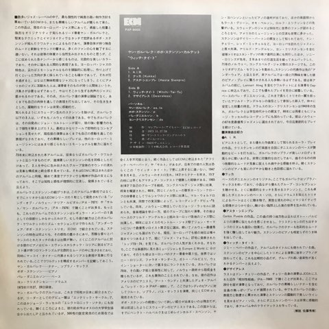ノルウェー出身のサックス奏者Jan Garbarekがスウェーデン出身のピアニストBobo Stensonとの双頭リーダーでECMからリリースした74年作。全員北欧出身のカルテットによる透徹した音色の甘美ながら緊張感のあるインタープレイが聴けるECMらしい傑作。空間を感じさせる録音はManfred EicherとともにECMサウンドを創り上げた名エンジニアJan Erik Kongshaug。