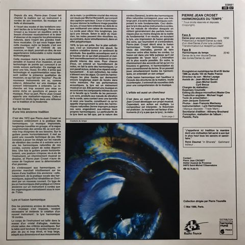 世界各地の伝統的な民族音楽を現地録音した数々の名盤で知られるフランスの名門レーベルOcora。そのOcoraが民族音楽ではなく新たな音楽を創造するために用意した異形の新シリーズ「Creation」からリリースされた86年作。フランスの音楽家/音楽学者/楽器研究者Pierre Jean Croset創作によるハーモニクス奏法に特化したツィター型18弦楽器ハーモニック・リラのソロ演奏を収録。ハーモニック・リラから放たれるクリアで細やかな音の粒子が空間に散りばめられていく音響アコースティック・サイケデリア傑作。「Creation」シリーズのDavid HykesやKudsi Erguner & Xavier Bellengerらの作品と並ぶ録音も内容も超一級の作品。