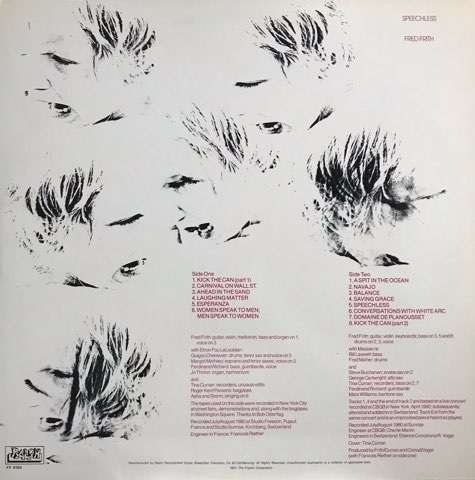 Henry Cow/Art Bears/Massacre/Skeleton Crewなど様々なアヴァン・バンドでの活動で知られるイギリスを代表するエクスペリメンタル・ギタリストFred FrithがThe ResidentsのレーベルRalphから81年にリリースしたソロ3作目。A面にはフランスのアヴァン・ユニットEtron Fou Leloublanが参加した、民族音楽的フレーズ、フィールド・レコーディングやテープ・コラージュなんかがガンガン出てくる奇天烈アヴァン・ポップなインストを、B面にはMasscreでのCBGBでのインプロ・ライブの抜粋や、スペインのトラッド・フォーク・シンガーRosa Zaragozaの91年名作「Galaneta Ma」に収められる「Son」の原曲になる「Domaine De Planousset」など収録しています。民族音楽も実験音楽も即興音楽もポップも等価に扱うFred Frithの感性が良く出た最高傑作のひとつ。