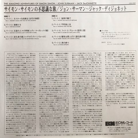 英フリージャズ/ジャズロックの様々な名盤でも知られるサックス奏者John SurmanがJack DejohnetterとのデュオでECMからリリースした81年作。ソプラノ、バリトン、バスクラ、そしてシンセサイザーまで駆使し多重録音によって創り上げた前作「「UPON REFLECTION」」をさらに発展させた作品。視聴はJohn Surmanの持つ詩情性とミニマリズムが良く出た2曲から。