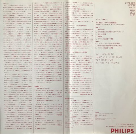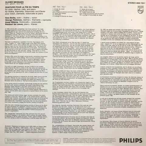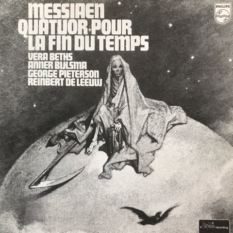 フランス現代音楽の巨匠Olivier Messiaenが第二次世界大戦でドイツ軍の捕虜となっていた時に収容所で作曲したという代表作のひとつ「世の終わりのための四重奏曲」。ゆったりとした演奏でErik Satieのアンビエント性を最大限に引き出した作品でも知られるピアニストReinbert de Leeuwが参加した1977年録音80年リリースのオランダ・フィリップス盤。視聴はそのde Leeuwのピアノが印象的な比類なき美しさの「イエスの永遠性への賛歌」「イエスの不滅性への賛歌」、ユニークなクラリネット独奏の「鳥たちの深淵」から。