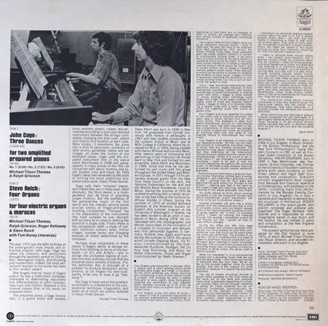 アメリカの指揮者/ピアニスト/作曲家Michael Tilson Thomas演奏による、A面にJohn Cageの「Three Dances」、B面にSteve Reichの「Four Organs」を収録した73年作。民族音楽的打楽器のようなプリペアド・ピアノが聴けるA面の「Three Dances」も凄く面白い演奏ですが、このレコードの目玉は何といってもB面のSteve Reich本人も参加した4台のオルガンとマラカスによる「Four Organs」。淡々とリズムを刻むマラカスにひたすら繰り返し展開していく4台のオルガンが時間の感覚を狂わすように引き延ばされていき、20分を超える頃には聴いたことのない景色に連れて行ってくれるミニマル古典!さすがSteve Reich本人が参加しているだけあってめちゃくちゃサイケデリックな名演中の名演。ほんとにこれは凄すぎます。視聴のFour Organs 1は最初から、Four Organs 2は21分頃から。