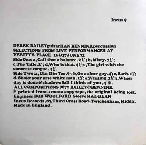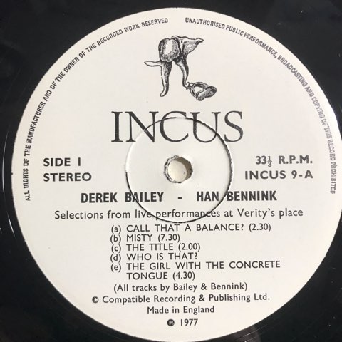フリー・インプロヴィゼーションのパイオニア的ギタリストDerek Baileyと、Eric Dolphy「Last Date」にMisha Mengelbergとともに参加しその個性的な即興演奏で知られるオランダの奇才ドラマーHan BennikがIncusからリリースした72年作。エキサイティングでユーモラスでスリリングな数々の瞬間を収めたフリー・インプロヴィゼーション・クラシック。