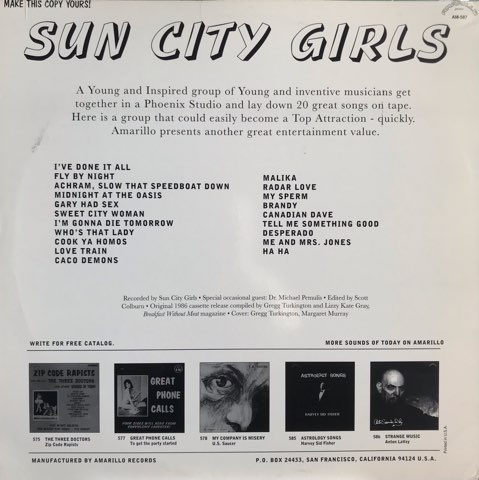近年も精力的に濃厚な内容の民族音楽をリリースするレーベルSublime FrequenciesのオーナーでもあるAlan Bishop、Rick Bishop兄弟が中心となり81に年結成された米アヴァン・ローファイ・バンドSun City Girlsが86年にカセットでリリースした音源を94年にLP化した一枚。ジャンクな演奏やテープ早回しによるムシ声なんかに混じる、Billy Paul「Me And Mrs. Jones」、Maria Muldaur「Midnight At The Oasis」、Looking Glass「Brandy」など本気なのか冗談なのかイマイチ分からない絶妙な選曲のメロウ名曲ヘロヘロカヴァーが最高です。
