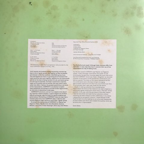 Derek Baileyによって考案されEvan ParkerやSteve Beresford、Lol Coxhill、John Zornなど錚々たるミュージシャンが在籍したフリー・インプロヴィゼーション/完全即興演奏集団Companyの記念すべき1作目。Derek Bailey、Evan Parker、Tristan Honsinger、Maarten van Regteren Altenamの4人が参加しそれぞれを組み合わせたトリオ編成の演奏を4曲収録。全員キレッキレのインタープレイを聴かせてくれますが、やはり1人異次元にいるようなDerek Baileyのギターは本当に圧巻です!
