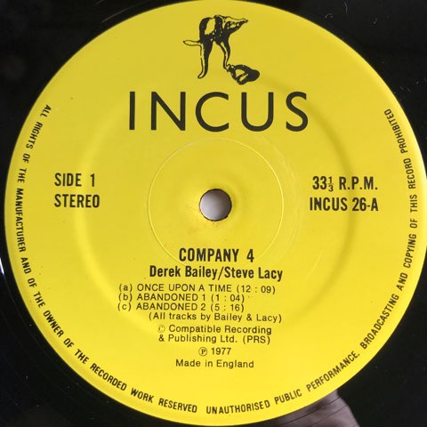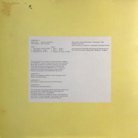 Derek Baileyによって考案されEvan ParkerやSteve Beresford、Lol Coxhill、John Zornなど錚々たるミュージシャンが在籍したフリー・インプロヴィゼーション/完全即興演奏集団Companyが77年にリリースした4作目でDerek BaileyとSteve Lacyによるデュオ作。この二人のインタープレイの距離感やフリーキーな方向に振り切らない温度感が物凄く絶妙で何度でも聴いてしまうフリー・インプロヴィゼーション傑作!、Incus作品群の中でも代表作に挙げられる一枚。