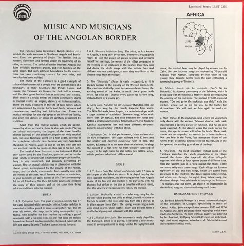 アフリカ中部〜南部に位置するアンゴラ北東部とザイール南西部に暮らすチョクウェ族の音楽を米民族音楽名門レーベルLyrichordが現地録音した一枚。ジャケットに強烈な印象を残す異形のシロフォンNdjimbaから繰り出される土着ミニマル・ミュージックや親指ピアノSanzaによる演奏、クイーカのルーツ楽器ともいわれている棒式摩擦太鼓Kwitaと合唱、プリミティヴなパーカッションによる仮面舞踏の音楽など独自音楽が満載!