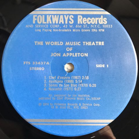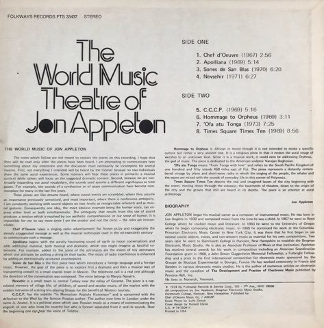 Don Cherryとの異色のデュオ作「Human Music」でも知られる電子音楽の先駆者Jon Appletonが米ルーツ名門レーベルFolkwaysからリリースした代表作のひとつ。電子音とともに頭の中で時代をワープしながら世界中を駆け巡るような音風景が展開される、1950年代のアメリカのラジオ広告、会話、民族音楽、自然音、シュトラウス、トルストイの声、町の雑踏なんかが絶妙にコラージュされたエレクトロニクス/ミュージック・コンクレート・マスターピース!