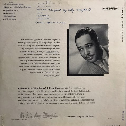 Duke Ellingtonのトリオ/デュオ編成による自作曲の演奏を収めた、Ellingtonのピアノにフォーカスを当てた作品。独特の間や不協和なハーモニー、叩きつけるような打鍵といった後のフリー/前衛派にも影響を与えたであろう奏法の「B Sharp Blues」、筆舌に尽くしがたい美しさの「Melancholia」、ユーモラスな「Dancers In Love」、代表曲の「In A Sentimental Mood」「Prelude To A Kiss」など、世紀の名盤「Money Jungle」とはまた違うEllingtonの個性的なピアノの魅力が詰まった名作!オリジナルは54年にリリースされた10inchですが「Melancholia」や「Dancers In Love」は収録されていないので是非4曲が追加されたこのLP盤で!後に名前を変えて「Piano Reflections」として再発もされます。