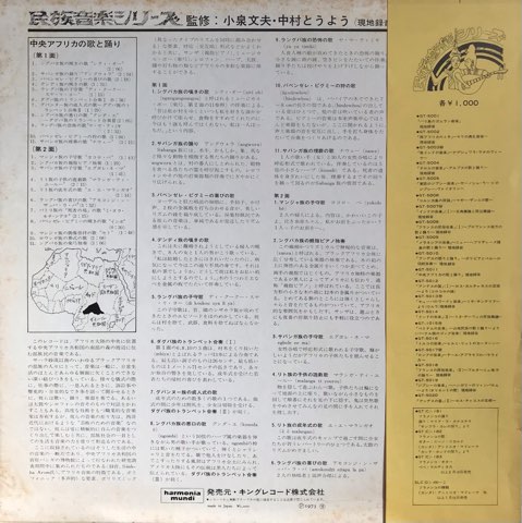 オリジナルは67年にフランスHarmonia Mundiから「Chants Et Danses De Centrafrique」としてリリースされたピグミー族始め中央アフリカ共和国の南部の森周辺に住む部族の民族音楽を収録した現地録音盤を、小泉文夫と中村とうよう監修の民族音楽シリーズで73年に国内ライセンス・リリースした一枚。Steve Reichの声楽傑作「Tehillim」のような「ピグミー族の喜びの歌」、不協和な「ダグバ族のトランペット合奏」、宇宙神秘的な響きの「ングバカ族の親指ピアノ独奏」、口琴楽器による「ングバカ族の楽弓独奏」など、原生のまま独自進化したような中央アフリカならではの天然ミニマル・ミュージックの数々。最高です!