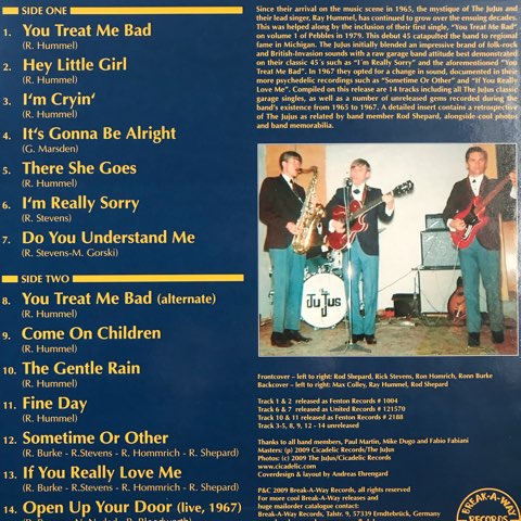 「Nuggets」と並ぶ人気ガレージ・コンピ・シリーズ「Pebbles」と「Back From the Grave」のそれぞれ記念すべきVol.1にも収録されたミシガン州のティーン・ガレージ・バンドThe JuJusが65〜67年に制作した7インチや未発表曲を集めたコンピレーション。オリジナル・シングルは鬼レアの「You Treat Me Bad」始め、無垢でナイーブ、トワイライトで胸キュンな最高のティーン・ガレージ名曲の数々を収録。曲がマジでいい!!