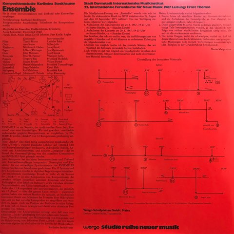 現代音楽を代表するドイツの作曲家Karlheinz Stockhausen企画による、12曲の作品が同時に演奏される4時間のコンサートを編集し創り上げた「1人の演奏家とテープまたは短波受信機のために創作された「Ensemble」」。12人の管弦楽器奏者の不協和な演奏に、12人の作曲家によるテープや短波レシーバーで作成されたノイズが不確定に干渉し合うことによって新しい響きを生み出す音響実験作品。67年録音。