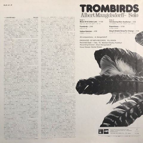 Jaco Pastorius、Peter BrotzmannやHan Benninkらとも共演しフリー・ジャズ・アンサンブルGlobe Unity Orchestraにも参加していたドイツ人奇才トロンボーン奏者Albert Mangelsdorffが73年にリリ−スしたトロンボーン・ソロ・アルバム。Albert Mangelsdorffらしい、多彩な奏法を駆使したユーモアあふれる独創的なフリー・インプロヴィゼーションを展開しています。そのユニークな音色に笑ってしまいそうになる「Trombirds」や、マルチフォニックスという重音奏法を駆使したまるで一人エリントン・アンサンブルのような不思議な響きの「Sing a Simple Song for Change」など。最高です!