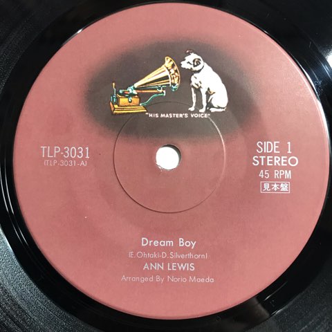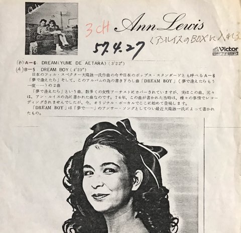 吉田美奈子の76年作「Flapper」に収録、シリア・ポールや鈴木雅之など数えきれないアーティストにカバーされている大瀧詠一作曲の「夢で逢えたら」をアン・ルイスが英語カバーした非売品プロモオンリーの7インチ・シングル。もう一曲も大瀧詠一作曲による「Dream Boy」。アレンジは前田憲男。