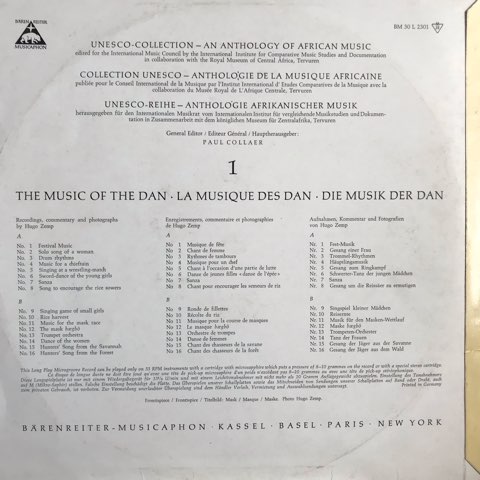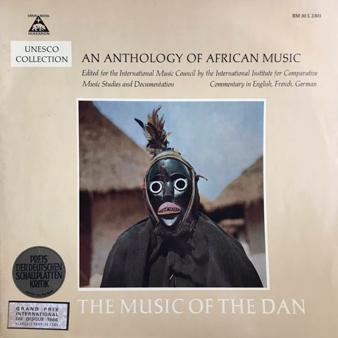 ユネスコ(国際連合教育科学文化機関)傘下にある音楽レーベルUNESCO Collectionから世界の伝統音楽シリーズとしてリリースされた、西アフリカのコートジボアール、リベリア、ギニアの3国の国境が交差する森林地帯に住むダン族の音楽を現地録音したレコード。仮面をかぶることにより自然に宿る精霊の力を借りるという仮面儀式音楽などプリミティヴでユニークすぎる独自音楽の数々を収録。視聴は象牙で作られたトランペットによる祝祭の音楽、ミルリトン(カズー)を使ったミニマルな合唱、親指ピアノ・ソロから。