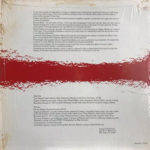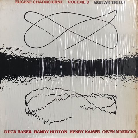 Shimmy DiscオーナーKramerとの変態オルタナ・バンドShockabillyでも知られるアメリカの奇人変人ギタリストEugene ChadbourneがA面にRandy Hutton、Richard Bakerと、B面にHenry Kaiser、Owen Maercksという全員ギタリストでのトリオ編成で77年に録音したアルバム。まるで動物や虫の鳴き声にも聴こえるユーモラスでフリーキーなギターが奇妙な異次元空間を出現させる、Eugene Chadbourneの個性が出まくった最高にユニークなインプロヴィゼーション!