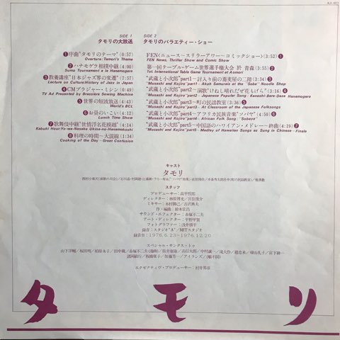 お笑いだけでなく音楽やサブカルチャーにも精通し孤高の位置を確立した日本を代表するマルチ・タレント、タモリが赤塚不二夫のレコード「ライブ・イン・ハトヤ」のプロデューサーでもある高平哲郎のプロデュースでリリースした77年ファースト・アルバム。ハナモゲラ全開の「ハナモゲラ相撲中継」「世界の短波放送」「歌舞伎中継”世情浮名花模様”」やインチキ外国語「テーブルゲーム世界選手権大会」、タモリの代表作ともいえる似非アフリカ民族音楽「ソバヤ」など、異様に質が高く圧倒的にバカバカしいタモリ・ワールドが展開されています。この無意味さは本当に素晴らしい!