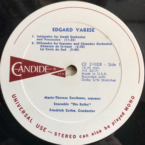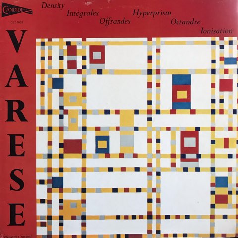 米クラシック名門VOXのサブ・レーベルCandideから70年にリリースされた、1883年フランス生まれのアメリカ人現代音楽作曲家Edgar Vareseの1920〜30年代の初期作をFriedrich Cerha指揮による演奏で収録した一枚。その中でもやはり注目は、少年時代のFrank Zappaにロックン・ロールやドゥーワップとともに絶大な影響を与えた「Ionisation」。「西洋音楽」の中から和音と旋律を排除した作品として先駆的な、荒々しい打楽器とノイズとしてのサイレンのみで構成された前衛的名曲です。