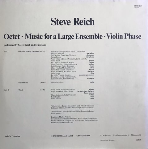 ミニマル・ミュージックを代表するアメリカの作曲家Steve ReichがECMからリリースした80年作。前作「18人の音楽家のための音楽」をさらに発展させた「Music For A Large Ensemble」は、ヴァイオリン、チェロ、フルート、クラリネット、ソプラノサックス、トランペット、ピアノ、マリンバ、ヴィブラフォン、木琴などが宝石のような響きを持って短いフレーズを繰り返しながらカラフルに表情を変えて展開していくミニマル史上に燦然と輝く金字塔的作品。永遠にこの音空間に浸っていたい至福の15分間。