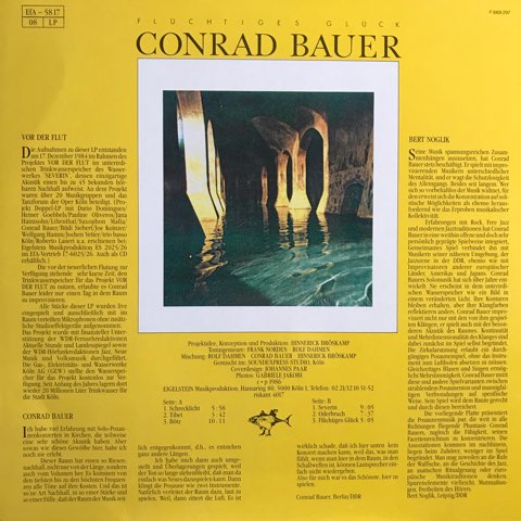 アメリカの瞑想音楽家Pauline Oliverosも参加した、100年前に作られたというドイツ・ケルンにある巨大な地下貯水槽の凄まじい残響が発生する構造を利用して録音された84年のコンピレーション「Vor Der Flut」。その作品に1曲収録されているドイツの奇才ジャズ・トロンボーン奏者Conrad Bauerが同じその地下貯水槽でアルバム一枚分トロンボーン・ソロ録音した86年作。残響を意識したConrad Bauerの特殊奏法によるフリーキーかつメディテーティヴという唯一無二の音響体験ができる怪盤。