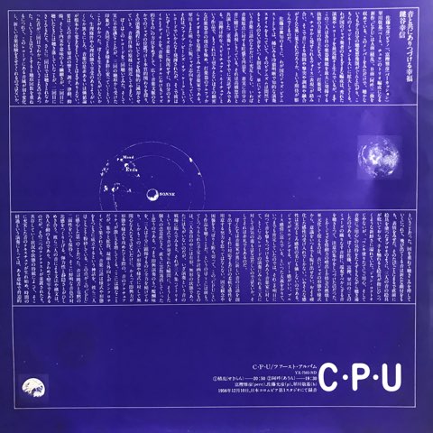 日本を代表するジャズ・ドラマー富樫雅彦とジャズ・ピアニスト佐藤允彦、そして即興集団「緑化計画」でも知られるチェロ/ベース奏者、翠川敬基によるユニットCosmic Pulsation UnityことC.P.Uが76年にリリースした唯一のアルバム。A面に「積乱」、B面に「阿吽」の片面に1曲づつを収録。間を活かした素晴らしく繊細で先鋭的なインタープレイからラストのトーン・クラスターのような音塊に展開する、アンビエント〜ノイズも内包したこのトリオならではの演奏が聴けるB面の「阿吽」が白眉です。