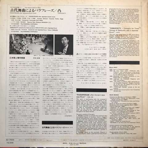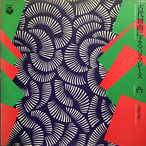 現代音楽家、三木稔が65年に作曲した「古代舞曲によるパラフレーズ」と70年作曲の「凸ー三群の三曲と日本太鼓のための協奏曲」を、その三木と長沢勝俊を中心に1964年に創立された現代邦楽の新たな可能性を追求する合奏団「日本音楽集団」による演奏で収録した一枚。和楽器を取り入れたアンサンブルによる、伝統的な音楽を現代音楽に昇華し日本独自の音楽を創造しようという気概に溢れた作品です。