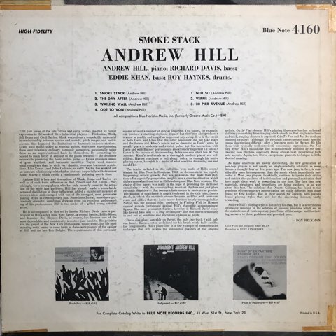 ジャズ界でも屈指の個性派ピアニストAndrew HillがBlue Noteからリリースした66年作。全曲Andrew Hillの作曲で、Eddie KhanとRichard Davisのダブル・ベース、Roy Haynesのドラムスという変則リズム隊によるポリリズムとAndrew Hillのアブストラクトなピアノが絡み合うポスト・バップ傑作。60年代Miles Davis黄金のクインテットに影響を受けたこの辺のポスト・バップ作品は今聴いても新鮮に響きます。
