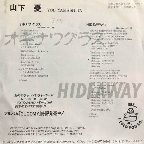 世界最高のソウル・ギタリストDavid T. Walkerのプロデュース・ワークとしても知られる、SSW山下優の88年シティポップ/ライトメロウ/ジャパニーズAOR作品「Gloomy」からプロモ・オンリーでカットされた7インチ・シングル・レコード。A面「オキナワグラス」はそのDavid T. Walkerのギターが堪能できるライト・メロウ名曲。B面「Hideaway」はTOTOのドラマーJeff Porcaroが参加してます。