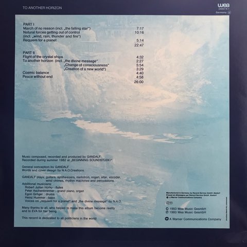 オーストリアのマルチインストゥルメンタル奏者Heinz Stroblによるプロジェクト・ユニットGandalfの82年3rdアルバム。全編に渡って幻想的でオーガニックなシンフォニック・サウンドを展開していますが、その中でも「To Another Horizon」はシタールとシンセサイザー、フルートが酩酊的に浮遊しミニマルなベース、サイケなギターとともに昇天していく極上のニューエイジ名曲!
