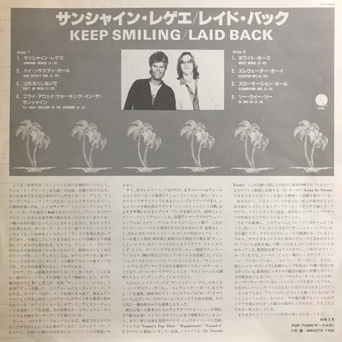 デンマーク出身のデュオ、Laid Backの84年セカンド・アルバム。楽観的な歌詞も含めて聴いているとアホになりそうなほどにゆるくメロウな代表曲「Sunshine Reggae」のほか、トロピカルながら鬼クールな「Fly Away / Walking In The Sunshine」、ロフト・クラシック「White Horse」など、レゲエやカリプソ、エレクトロなどを吸収してポップに昇華してますが、どこか冷めてひねくれた彼ら独自のセンスによって甘ったるくない作品に仕上がってます。