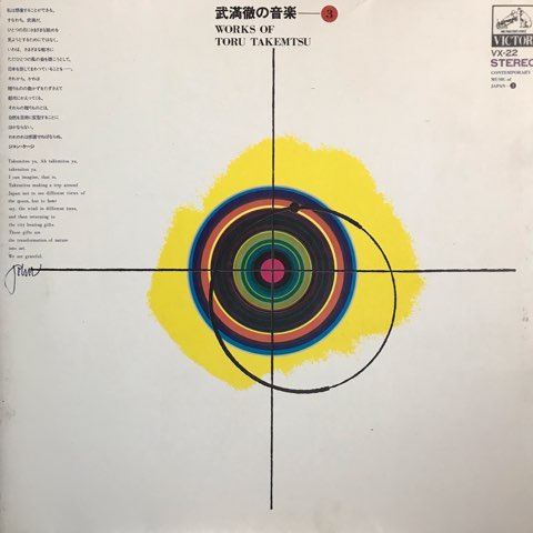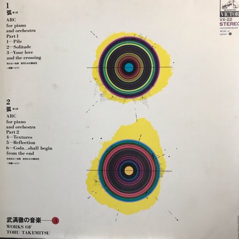 前衛だけにとどまらずポップスなどにも素晴らしい名曲を残している生粋の音楽家、武満徹の1960年代に書かれたピアノとオーケストラのための六部からなる組曲「ARC」を収録したレコード。激しいソロ・ピアノ、管楽器や弦楽器のクラスター、色とりどりの打楽器類が交錯しあい形作っていく混沌とした小宇宙的な音世界。視聴は凄まじいトーン・クラスターが迫ってくる「Texture」。ぜひ爆音で!