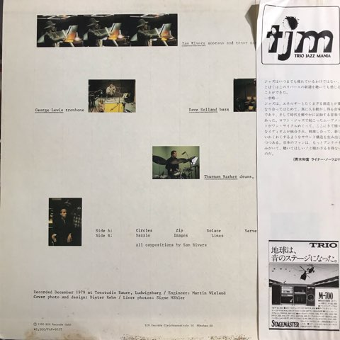 Bluenoteにも作品を残しMiles Davis Quintetにも参加、フリージャズ・シーンでの活動でも知られるテナー・サックス奏者Sam RiversがECMからリリースした80年作。Anthony BraxtonやAACMとも関わりの深いDave Holland、Thurman Barker、George Lewisとのカルテット編成。Thurman Barkerのマリンバを中心に奇妙な宇宙的音世界を演出するECMらしい音響ジャズ「Solace」「Images」が白眉。