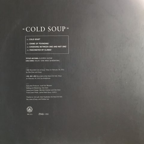 日本を代表する前衛ギタリスト秋山徹次とNYを拠点とするマルチインストゥルメンタリストChe Chenの共作アルバム。A面に2011年東京でのライブを、B面に2012年東京のスタジオでの即興録音を収録。シューゲイザー的ともいえる轟音ノイズのA面、音数の少ないやりとりも聴けるアンビエントなB面、どちらも最高にカッコいいです。