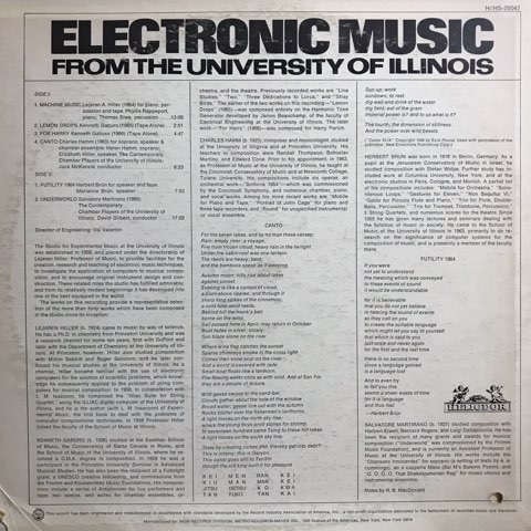 電子コンピュータで作曲された世界最初の楽譜といわれる「イリヤック組曲」の作者Lejaren A. Hillerによるピアノと打楽器とテープ作品「Machine Music」、アメリカの前衛作曲家Kenneth Gaburoによる電子音楽「Lemon Drops」「For Harry」、ドイツ・ベルリン生まれの作曲家Herbert Brunのテープと話しによる「Futility 1964 For Speaker And Tape」など60年代にイリノイ大学で制作された電子音楽を収録したアルバム。