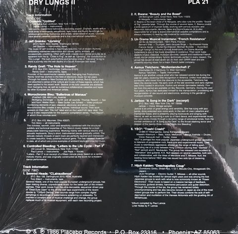 米Placebo Recordsから86年にリリースされたノイズ/アンビエント/テープ音楽/インダストリアルなどエクスペリメンタルな音楽を収録したオムニバス・アルバム。日本からはキング・オブ・ノイズこと非常階段やYBO2が参加。Chee Shimizuによるディスクガイド『OBSCURE SOUND REVISED EDITION』にも掲載され現在再評価されているアンビエント/ニューエイジ作家Tim Storyやフランスの前衛集団Un Drame Musical Instantane、ドイツ電子音楽界のアウトサイダーAsmus Tietchensの曲が収録されているのもポイントが高い好内容のコンピです。