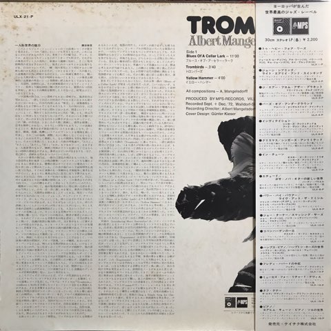 Jaco Pastorius、Peter BrotzmannやHan Benninkらとも共演しフリー・ジャズ・アンサンブルGlobe Unity Orchestraにも参加していたドイツ人奇才トロンボーン奏者Albert Mangelsdorffが73年にリリ−スしたトロンボーン・ソロ・アルバム。全編に渡ってAlbert Mangelsdorffらしい多彩な奏法を駆使したユーモアあふれる独創的なフリー・インプロヴィゼーションを展開しています。そのユニークな音色に笑ってしまいそうになる「Trombirds」や、マルチフォニックスという重音奏法を駆使したまるで一人エリントン・アンサンブルのような不思議な響きの「Sing a Simple Song for Change」など。最高です!