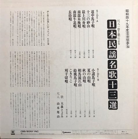 人間国宝の尺八奏者・山本邦山と演歌歌手・大森とよみによる異色の民謡集。従来の民謡では楽器は伴奏という形で唄のメロディーに従いそれに追従していくというのが基本ですが、こちらは山本邦山の尺八を主体とし大森とよみの歌のメロディがそれに従うように編曲されているらしく尺八の幻想的な響きがかなりの存在感を放っており、民謡とは思えないほどのスピリチュアルな仕上がりになっています。これはカッコいい!