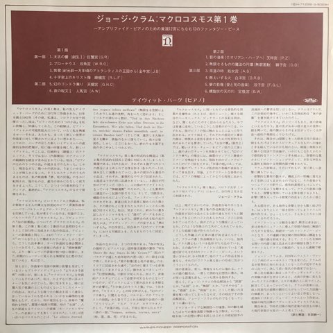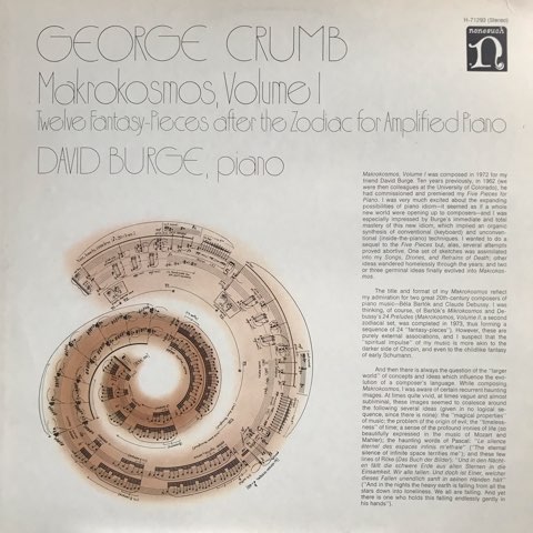 徹底的な音色の探究や特殊奏法の開発で知られるUS前衛作曲家George CrumbがピアニストDavid Burgeのために作曲したアンプリファイド・ピアノのための「Makrokosmos Volume I」。様々な特殊奏法によってイマジネーション溢れる豊かで多彩な音色をピアノから引き出した音響宇宙作品。