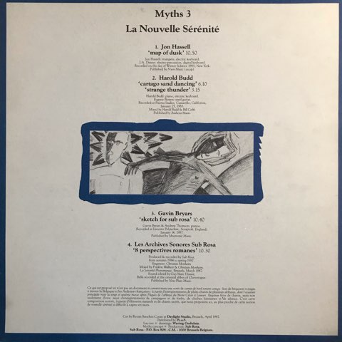 アヴァンギャルドから民族音楽まで網羅するベルギーのレーベルSub Rosaから87年にリリースされたJon Hassell 、Harold Budd、Gavin Bryarsの書下ろし作品を集めたコンピレーション。冒頭ミニマルな第四世界を現出させるJon Hassell「Map Of Dusk」から始まりHarold Buddの極上ニューエイジにGavin Bryarsのアンビエント・ピアノとどれもオリジナル・アルバムには未収の名曲を収録。ジャケットの質感も最高で宝物のようなアルバムです。是非これはレコードで!