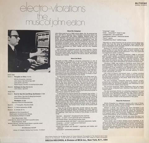 1960年代にMoog博士などと共同でシンセサイザーの開発などに関わった電子音楽の草分けの一人であるアメリカの作曲家John Eatonの73年作。このアルバムではその開発したシンセサイザー、シンキットを自ら操り電子オペラ、シンセ・ソロやモーグとのデュオ、そしてクラリネット、オーボエ、フルートとの室内楽編成までアヴァンなエレクトロニック・サウンドを聴かせてくれます。『電子音楽 In The(Lost)World』掲載盤。