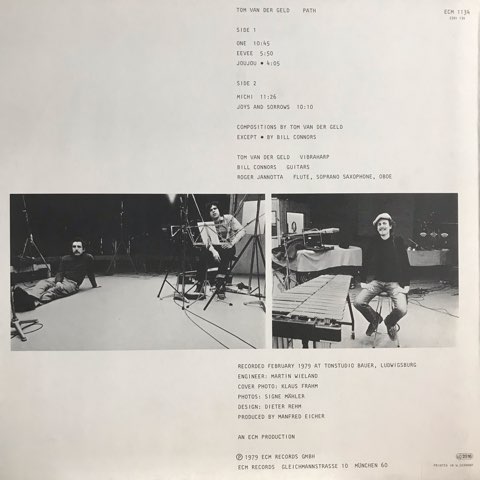 ヴィヴラフォン奏者Tom Van Der GeldがECMからリリースした79年作。ギターのBill ConnorsとリードのRoger Jannottaによるトリオ編成で、空間を感じさせる録音によってより残響が美しく響くTom Van Der Geldのヴィブラフォンを中心に透明感のある室内楽的インタープレイを繰り広げていく実にECMらしい作品です。名作!
