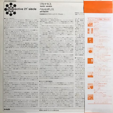 20世紀現代音楽が生んだ最高の前衛作曲家の一人Iannis Xenakisの最大の問題作といわれる「Persepolis」の初録音盤。金属打楽器や民俗楽器の録音のループを使ったミュジック・コンクレートによる手法で創られたという両面合わせて45分超のノイズを収録。様々に表情を変えて迫ってくるこの轟音は唯一無二!アヴァンギャルド金字塔的作品!