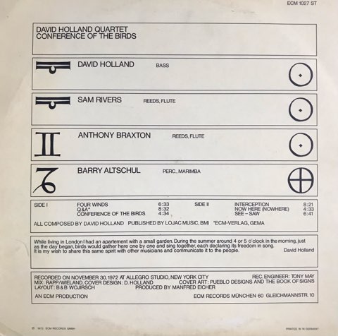 Miles Davis「In A Silent Way」や「Bitches Brew」にも参加しているイングランド出身のジャズ・ベーシストDave Hollandの初リーダー作。Anthony Braxton、Sam Rivers、Barry Altschulによるカルテット編成。疾走するプログレッシヴ・ジャズ「Four Winds」、Barry Altschulのマリンバが強烈な印象を残す「Conference Of The Birds」など収録の初期ECM傑作。